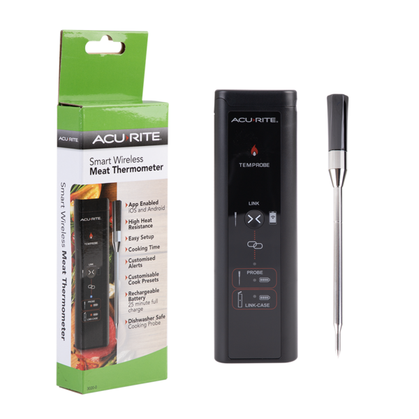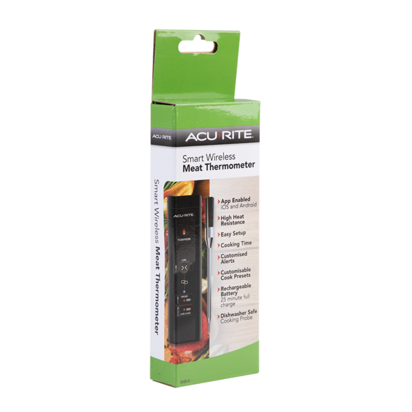 ACURITE SMART WIRELESS MEAT THERMOMETER SKU: 3020-0 Barcode: 9313492830200Pack Size: 12/48 The Smart Wireless Meat Thermometer from AcuRite – your ultimate kitchen companion for perfectly cooked meals every time! <br/> <br/> This advanced thermomet
