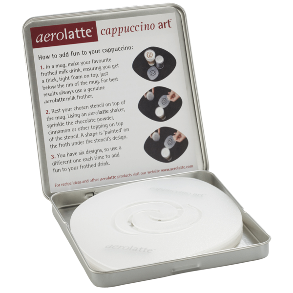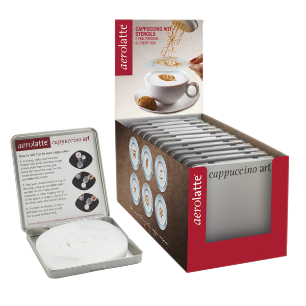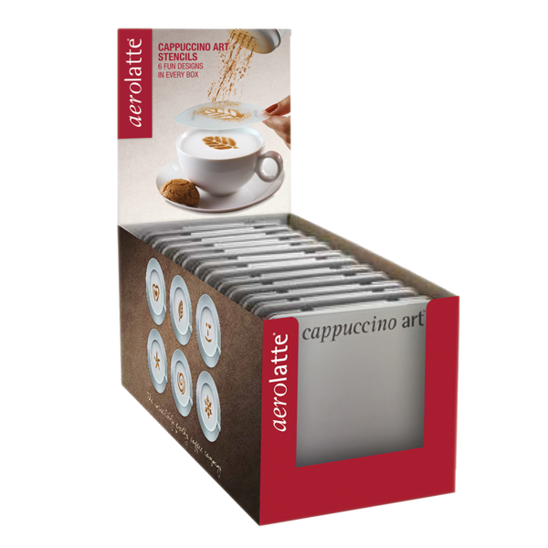 AEROLATTE CAPPUCCINO ART COFFEE STENCIL (CDU 12) SKU: 4120 Barcode: 5039179000882Pack Size: 1/9 Create barista-like designs for your favourite hot drinks at home using the fun Cappuccino Art Stencils from Aerolatte.<p> <p> The set includes 6 different d