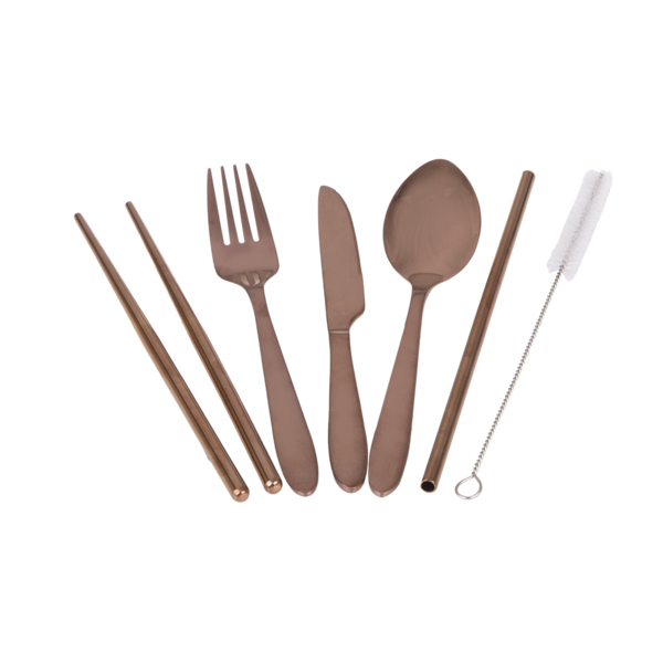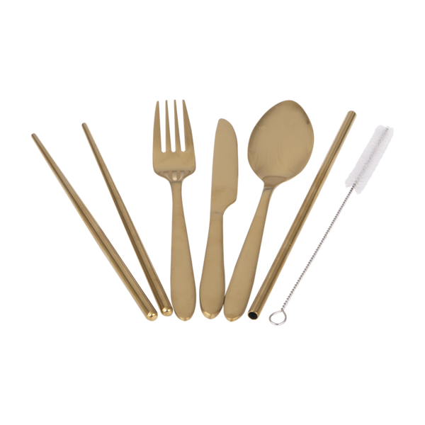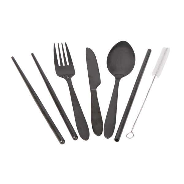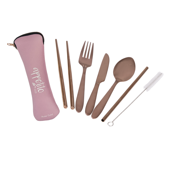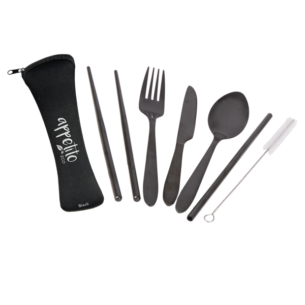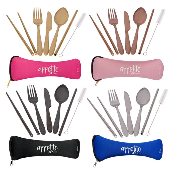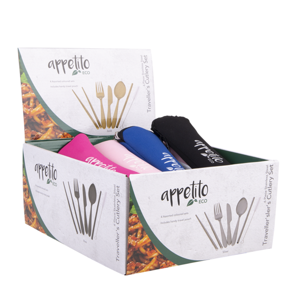 APPETITO 6 PIECE STAINLESS STEEL TRAVELLER'S CUTLERY SET (CDU 16) - ASST. COLOURS SKU: 3430 Barcode: 9313492934304Pack Size: 4 Be eco-conscious and sustainable by replacing plastic or disposable cutlery with a 6 Piece Stainless Steel Traveller's Cutlery Set from Appetito, perfect for wh