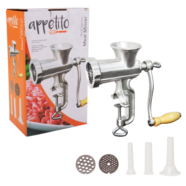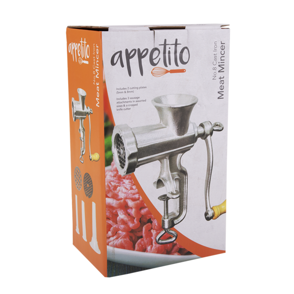 APPETITO CAST IRON MEAT MINCER NO. 8 SKU: 2428 Barcode: 9313492824285Pack Size: 4 Avoid artificial flavourings and preservatives, manage what you’re eating and control ingredients of your own ground meat using the No. 8 Cast Iron Meat
