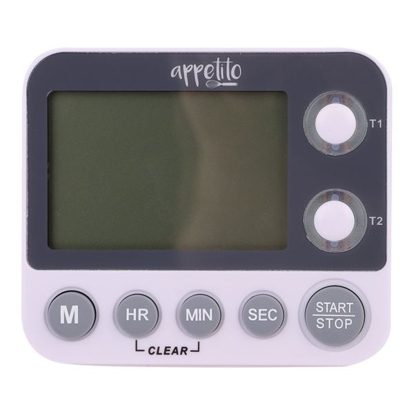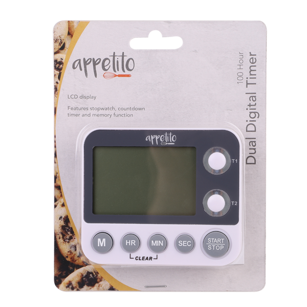 APPETITO DUAL DIGITAL TIMER - 100 HOURS SKU: 3478 Barcode: 9313492634785Pack Size: 20/100 This clever Dual Digital Timer unit from Appetito lets you multitask even the most complex of tasks. With LCD display for superior easy-to-read picture and ener