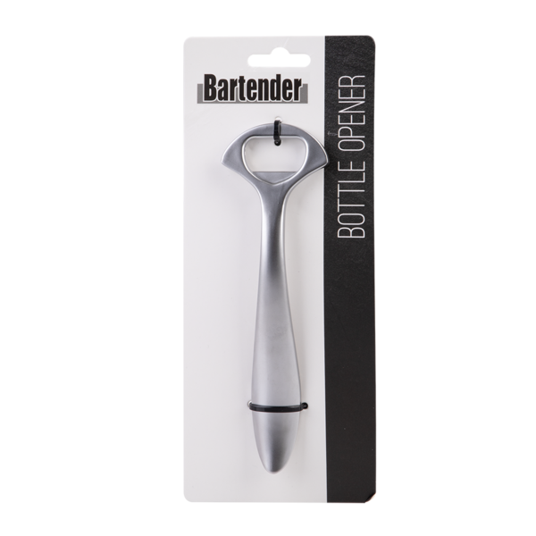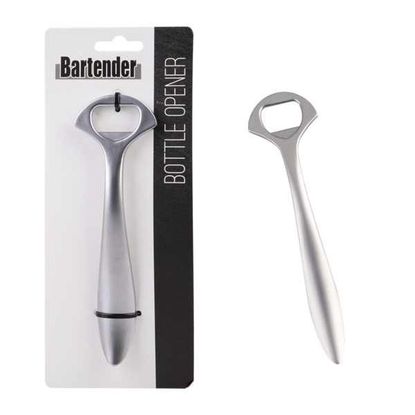 BARTENDER BOTTLE OPENER SKU: 7000-1 Barcode: 9313492170009Pack Size: 12/48 Details Open bottle caps with ease using the Bartender Bottle Opener. An essential for any home or bar, this stylish bottle opener features a c... DetailsBackDetailsOpen bottle caps with ease using the Bartender Bottle Opener. An essential for any home or bar, this stylish bottle opener features a comfortable ergonomic handle and durable white nickel plated finish. White nickel plated finish.Ergonomic handle. Handwash only.