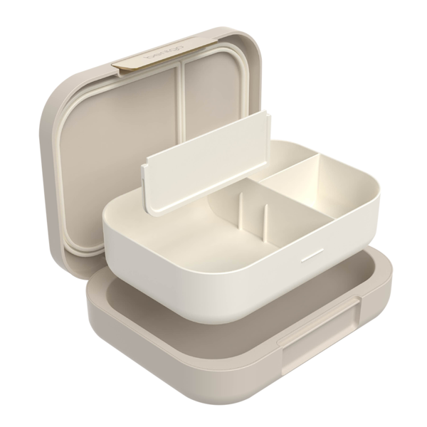 Delight in the bento-style lunch box's versatile design by choosing to use three or four-compartments with a removeable divider, with the box also looking stylish with a contoured outer shell with a sleek matte finish, secured closed with a shiny metallic clip.