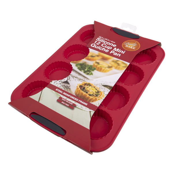 SALE DAILY BAKE SILICONE 12 CUP MINI QUICHE PAN - RED SKU: 3108 Barcode: 9313492831085Pack Size: 16 Made from premium quality, BPA-free food-safe silicone, the 12 Cup Mini Quiche Pan from Daily Bake is outstanding quality for baking your favourite quiche treat