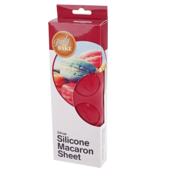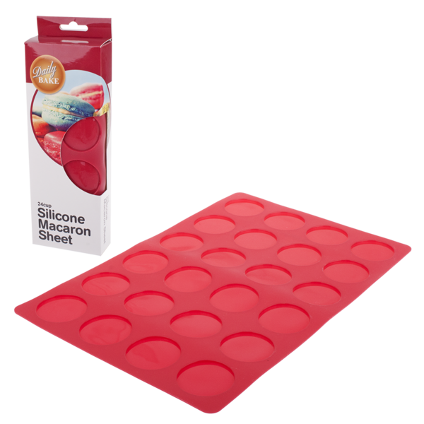 SALE DAILY BAKE SILICONE 24 CUP MACARON SHEET - RED SKU: 3076 Barcode: 9313492930764Pack Size: 12/48 Made from high quality silicone, the Daily Bake Macaron Sheet helps make up to 12 perfectly shaped macarons at a time with this 24 cup sheet.