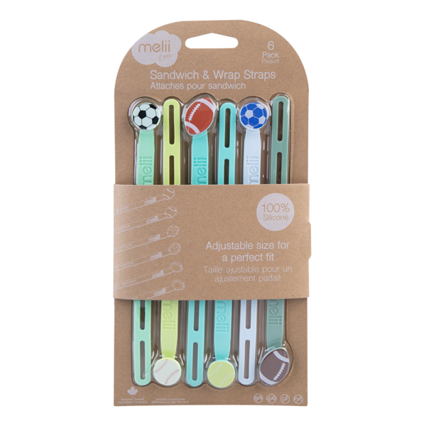 NEW MELII LUXE SILICONE WRAP BANDS - SPORTS BALLS SKU: 8563-2 Barcode: 790693403560Pack Size: 4/144 Game on for mess-free meals with the Melii Luxe Silicone Wrap Bands. Built for hungry champions, these clever silicone bands adjust to hold wraps, burritos, or