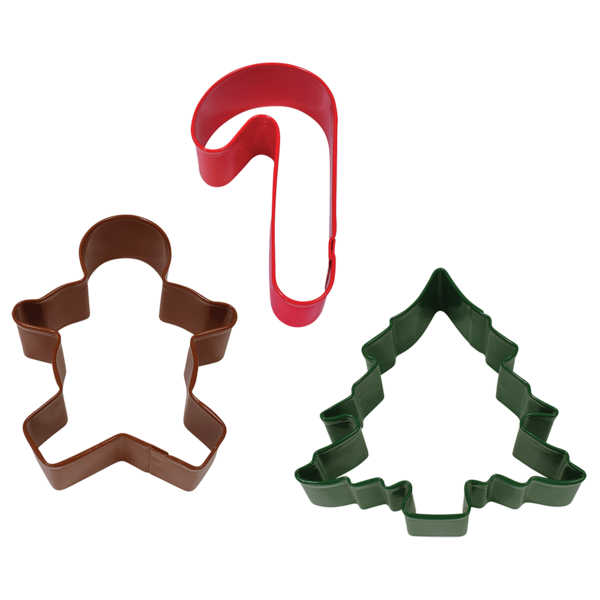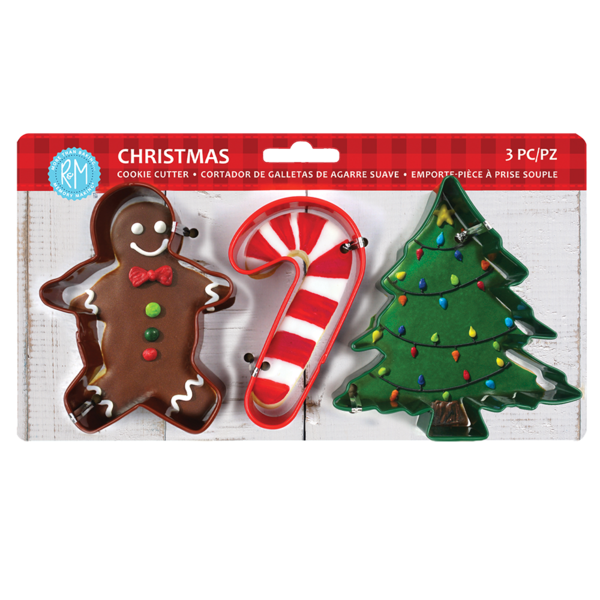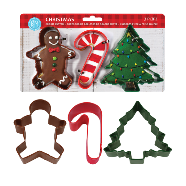 R&M XMAS COOKIE CUTTER SET 3 - MULTI-COLOUR SKU: 2760-1 Barcode: 768545051153Pack Size: 12/72 Make Christmas baking fun and festive with this set of three Xmas Cookie Cutters from R&M, including a gingerbread man, candy cane and Christmas tree cookie cut