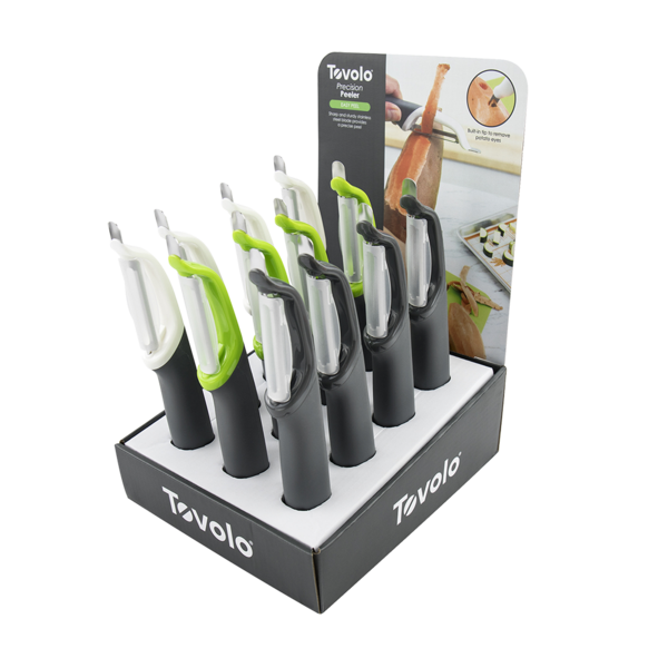 TOVOLO PRECISION PEELER (CDU 12) - 3 ASST. COLOURS SKU: 4858-1 Barcode: 848113027725Pack Size: 3 Peeling is easy with the Precision Peeler by Tovolo.<p> <p> The sharp and sturdy stainless steel blade provides a precise peel, with a swivel function to ens
